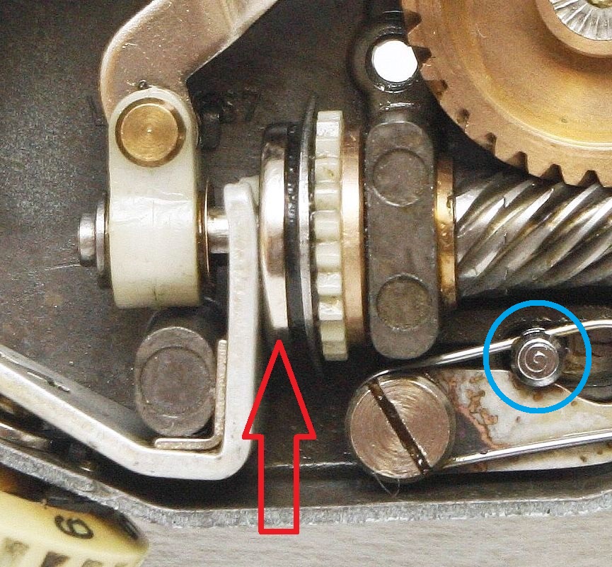 Bei den ersten Cardinal Modellen wurde noch diese tellerförmige hintere Reibscheibe verwendet , roter Pfeil. Außerdem wurde der Schieber der Rücklaufsperre ausgetauscht, gegen einen mit C-Clip, der originale hatte das noch nicht, siehe blaue Markierung! Beides war damals eine Verbesserung !