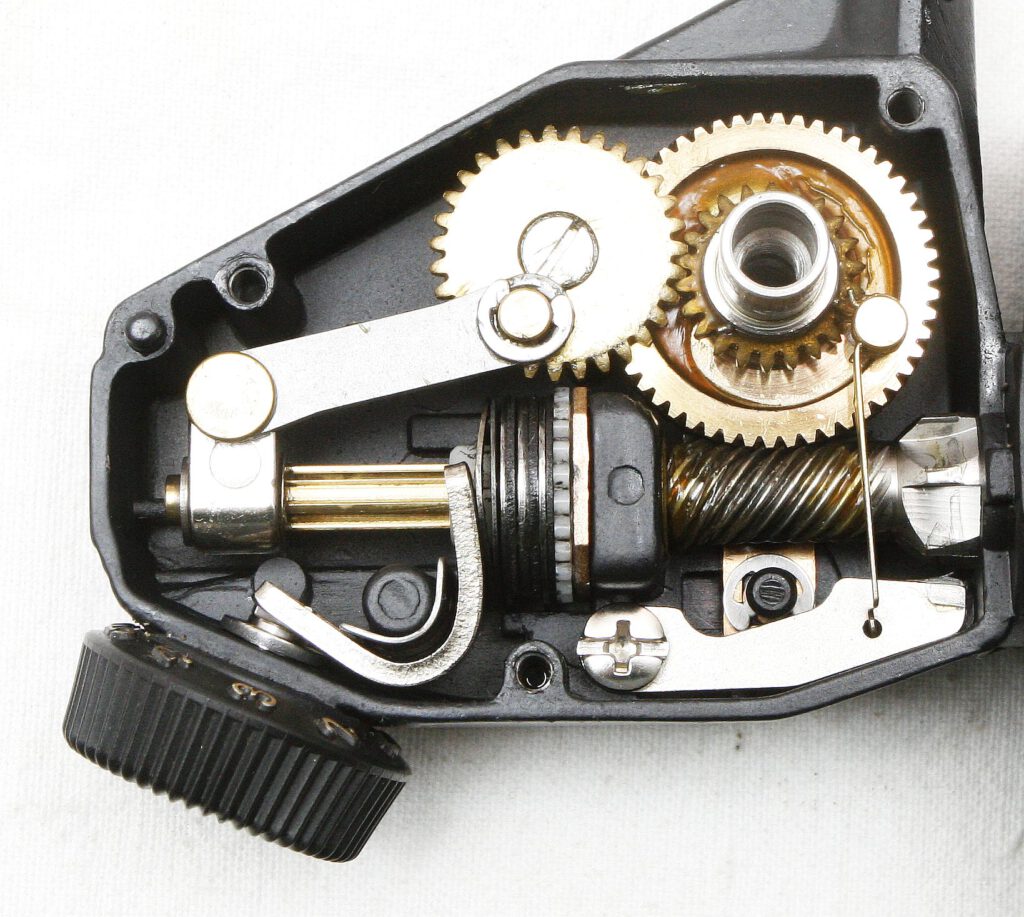 Das sehr interessante Getriebe, einerseits gibt es Teile, die sind noch wie an der ersten Cardinal 44 von 1968, anderseits eine sehr interessante geräuschlose Rücklaufsperre, mit Kupplung und Koppelstange. Außerdem fällt auf, sie hat jetzt eine dritte Bremsscheibe bekommen und eine Zentrierhilfe für den Seitendeckel. Und der Antrieb selbst ist frei von Kunststoffteilen, das gefällt mir besonders gut daran !