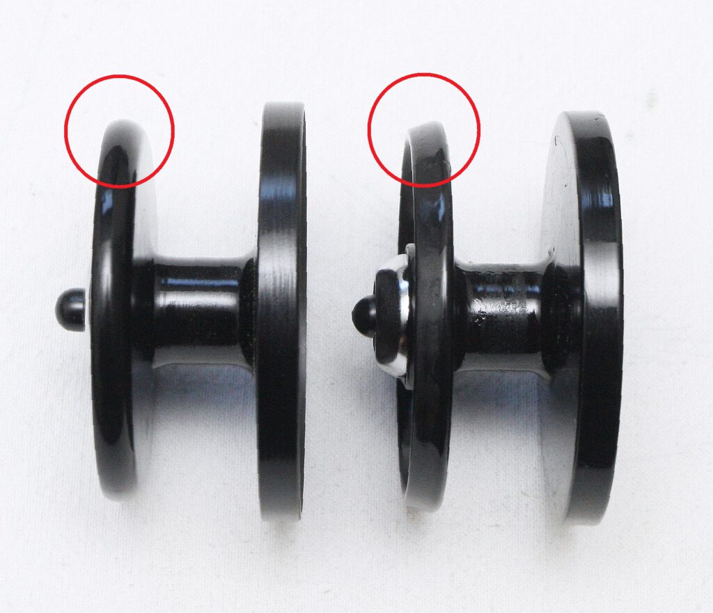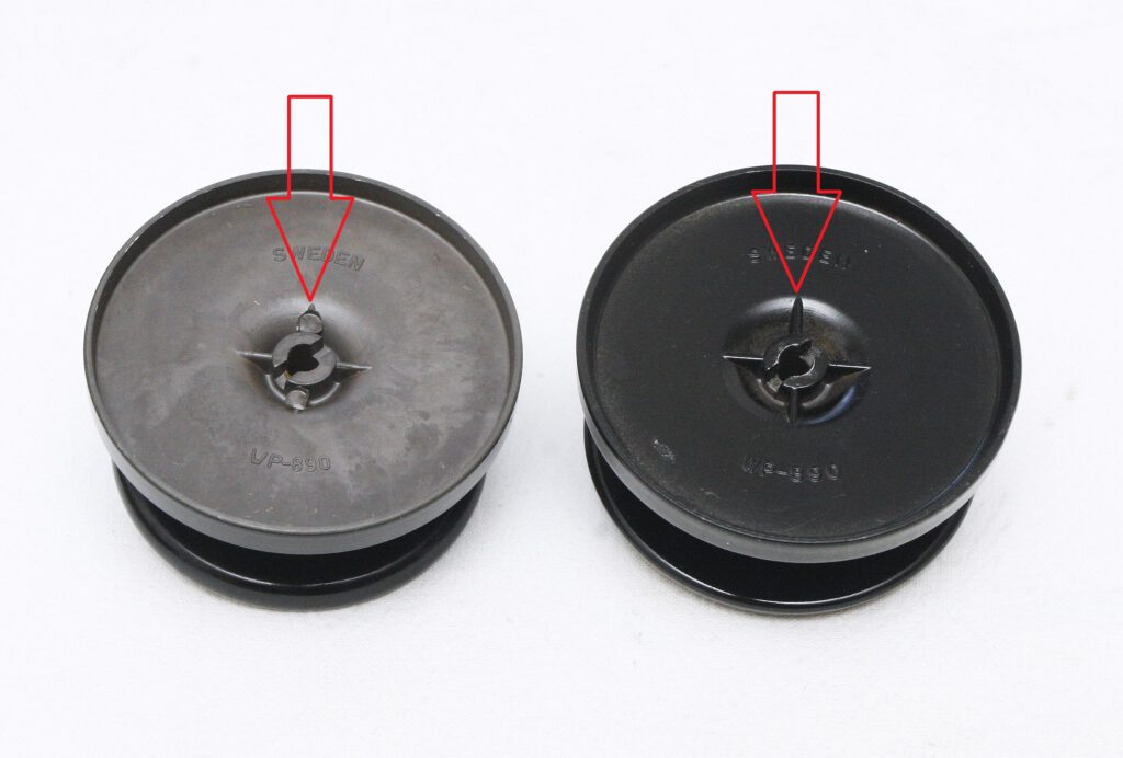 Version 1 on the left, the biggest difference between the two spools was the front lip. The radius was significantly larger on the left one. Advantage: This allowed for much greater casting distances! Disadvantage: If the spool was too full, the line could easily jump off!
