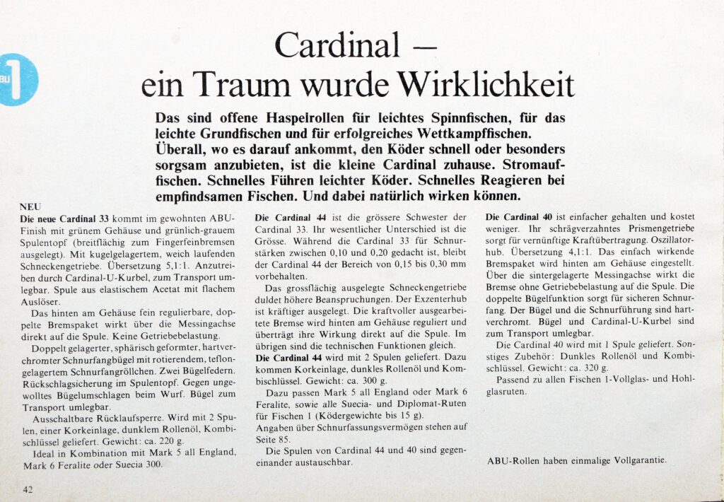 Die Beschreibung der ABU Cardinal 33 aus dem Petri Heil Katalog von 1975.