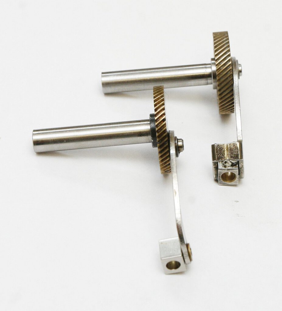 Oben das erste Schneckenrad mit Antriebsarm von 1969 unten das letzte Schneckenrad mit Antriebsarm von 1976.