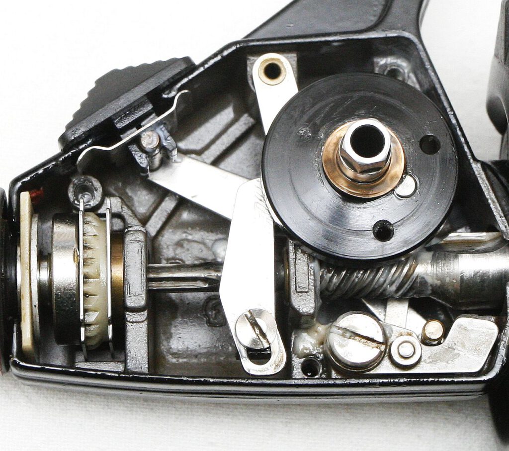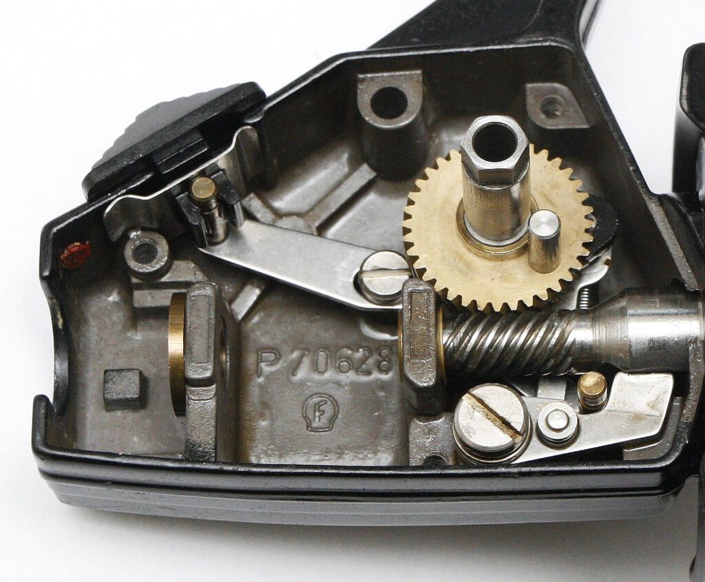 Rechts unter dem Schneckenrad und der Schneckenwelle, sieht man die neue geräuschlose Rücklaufsperre. Außerdem kann man gut erkennen das die Welle nur eine einzige Aussparung besitzt ! Damit sollte garantiert werden, das der Bügel immer an der selben Stelle zum Wurf steht und leicht zu greifen ist ! Gleichzeitig ist der Rotor mit einer Nut gesichert und kann nur in einer Stellung montiert werden !