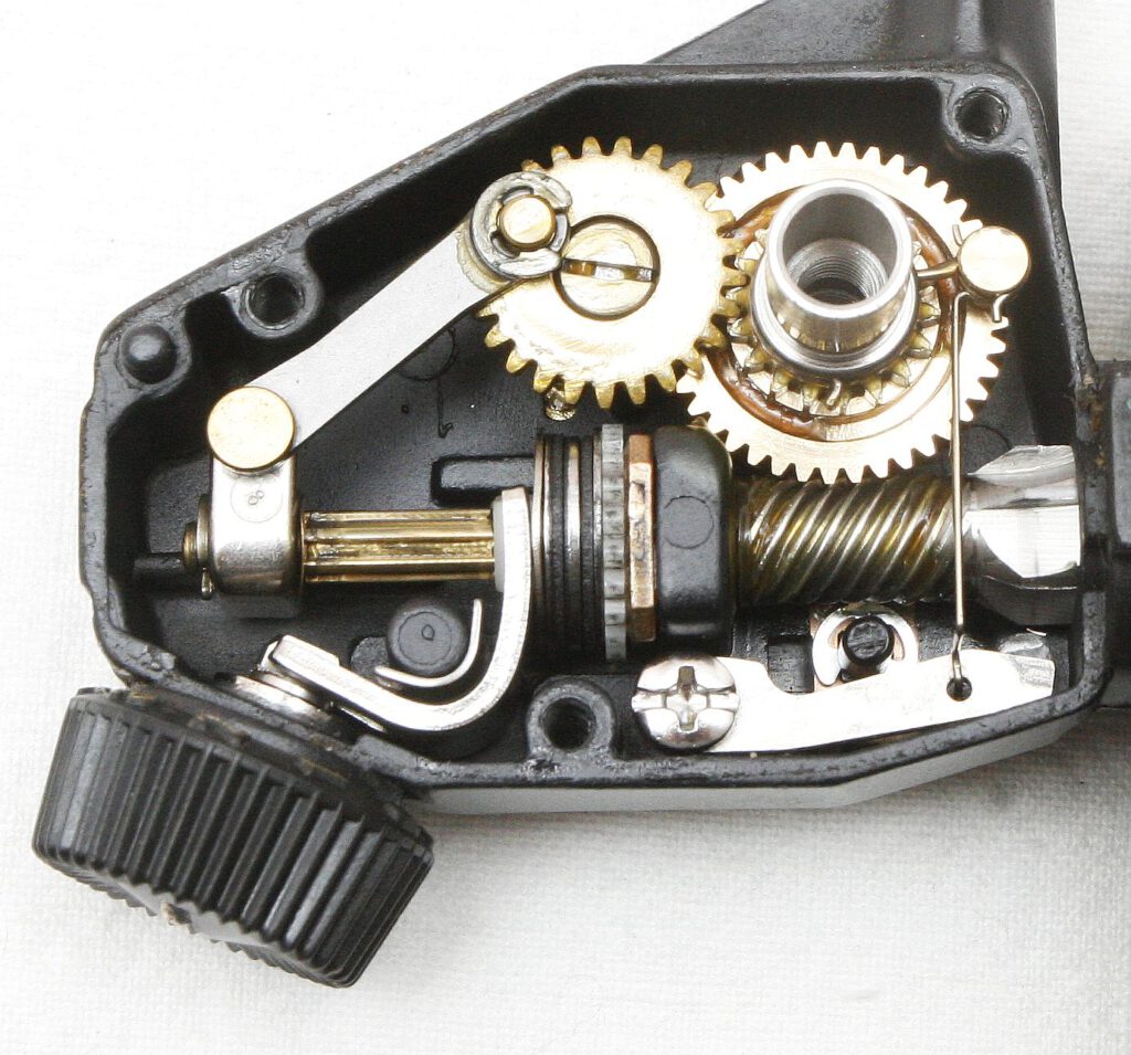 Das sehr interessante Getriebe, einerseits gibt es Teile, die sind noch wie an der ersten Cardinal 33 von 1974, anderseits eine sehr interessante geräuschlose Rücklaufsperre, mit Kupplung und Koppelstange. Außerdem fällt auf, sie hat jetzt eine Zentrierhilfe für den Seitendeckel bekommen. Und der Antrieb selbst ist frei von Kunststoffteilen, das gefällt mir besonders gut daran !