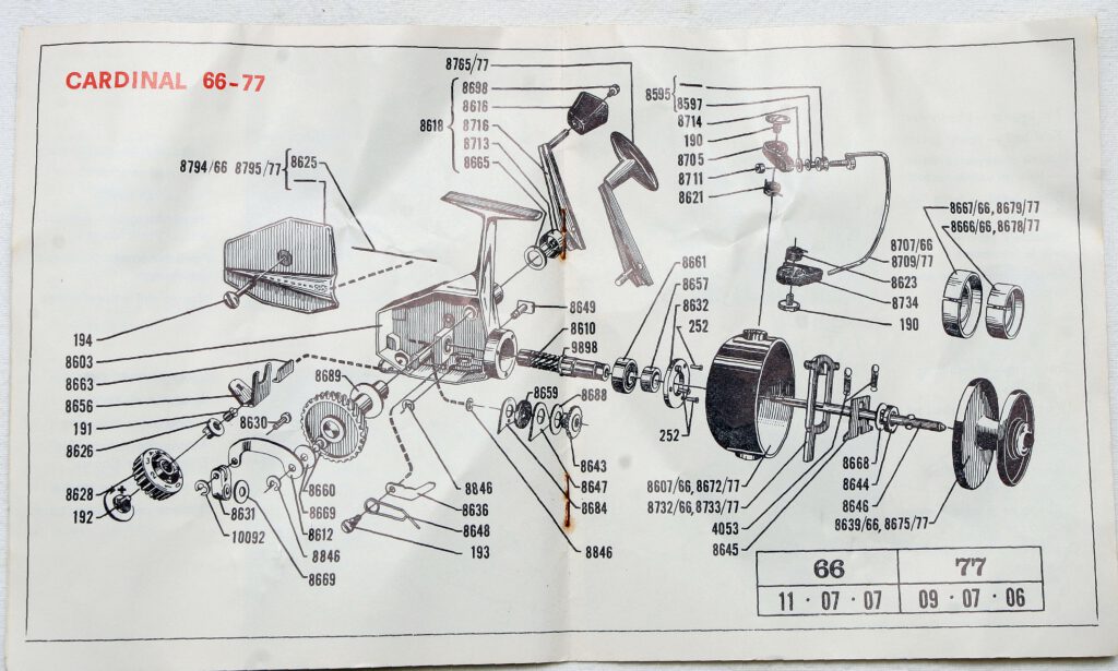 Cardinal 66 + 77, manufactured in 1967. Interestingly, as you can see, both models are from July 1967, but have different revision numbers! This means that although many parts were identical, the technical modifications were implemented differently in each model series!