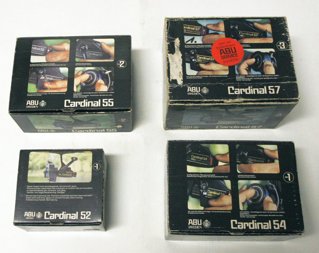 Die ABU Cardinal 52 + 54 + 55 + 57 Built by ABU Sweden, jeweils zum Vergleich im Karton ! Die Kartons für die „Swedenmodelle“ und die „Exportmodelle Europa“ sind übrigens gleich, die USA Kartons sind anderst!
