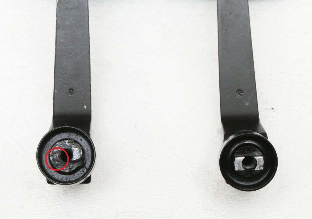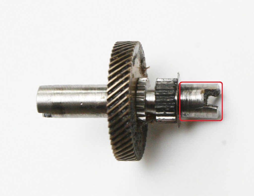 On the left side of the crank, you can see that the breakage of the drive pin on the crank is what’s causing the real problems! The left part is completely broken off, and the right part is already badly worn and conical. This, of course, causes the recess in the drive shaft to bend open.