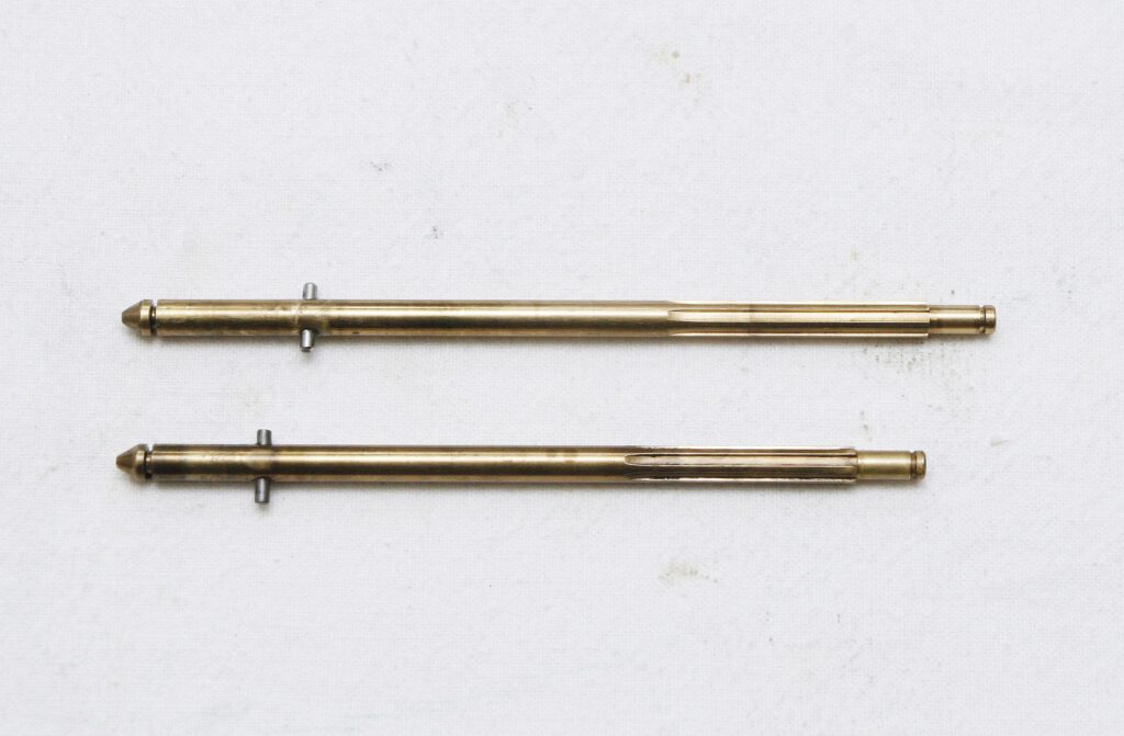 The upper axle is from an ABU Cardinal C4x Black, manufactured between 1987 and 1991, while the lower one is from an ABU Cardinal 44 Express, manufactured in 1975. Both axles are very similar and, due to their superior sliding properties, are made of brass. This has the advantage that a separate bronze bearing bushing is not required in the worm shaft, unlike the 66 and 77 models, where the axle was made of steel. Due to the greater length of the C4x axle, it is more prone to bending, for example, if handled incorrectly when encountering a heavy snag.
