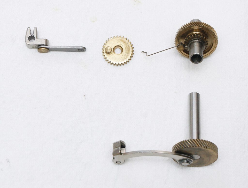 The upper gears are from the Cardinal C4x Black (1987-91) and the lower one from the Cardinal 44 Express (1974). The clutch with the wire connecting rod for the silent anti-reverse mechanism is clearly visible at the top. Also visible at the top are the two additional gears, which ensured the line was wound more smoothly.